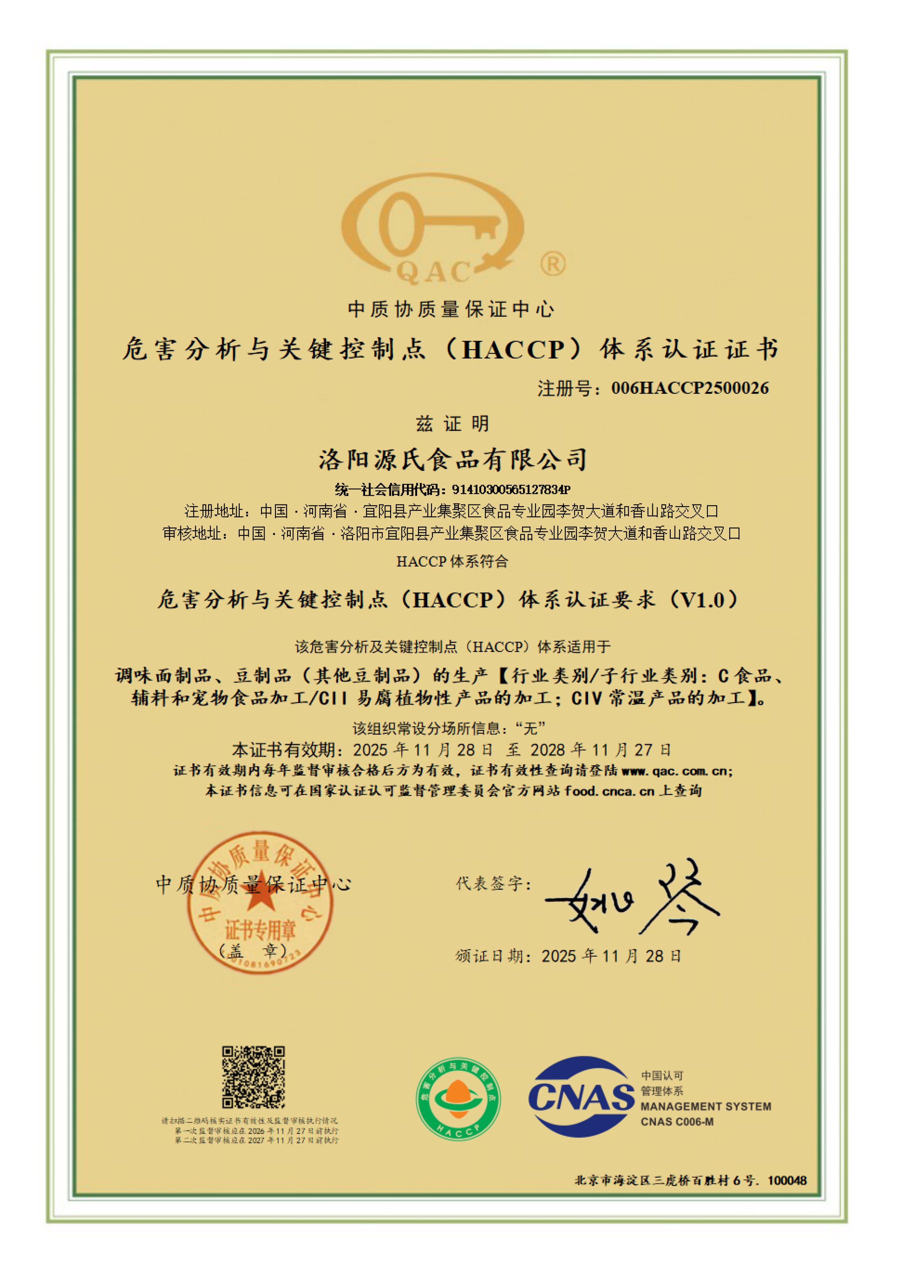 危害分析與關(guān)鍵控制點(diǎn)(HACCP)體系認(rèn)證證書
