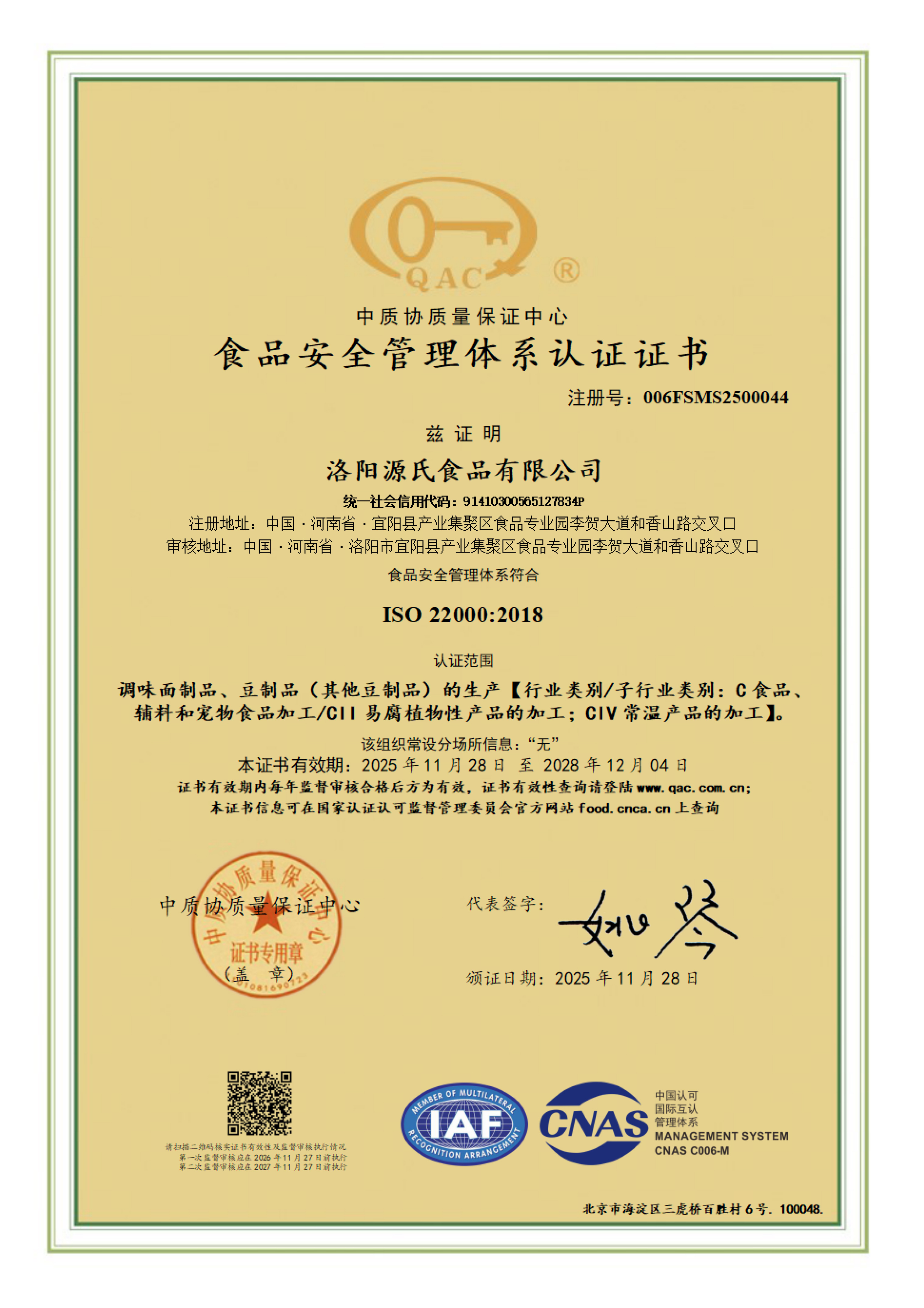 食品安全管理體系認(rèn)證證書